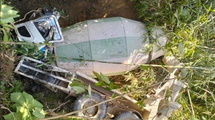 Truk berisi campuran cor itu terjun bebas ke jurang setelah diturunan daerah jalan poros Keang-Kalumpang.