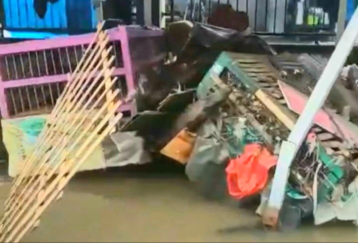 Tak hanya itu, kios berjejeran disekelilingnya-pun juga nampak berceceran, roboh bahkan ada yang terbalik hingga berpindah tempat akibat terjangan banjir.