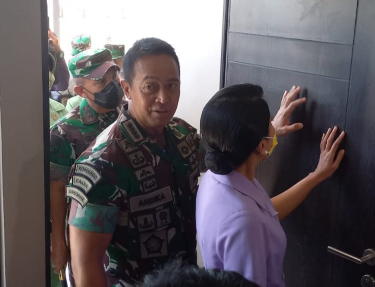Dalam kunjungan tersebut  Panglima TNI Jendral Andika Perkasa bersama Istrinya Hetty Andika, meninjau perumahan prajurit  yang baru saja selesai di kerjakan.