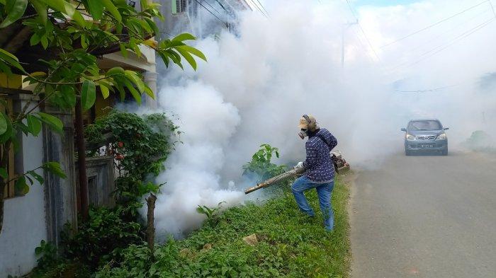 MAMUJU – Petugas dinas kesehatan melakukan fogging atau penyemportan asap di Kelurahan Karema, Kecamatan Mamuju, Sulawesi Barat.